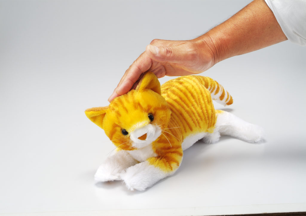 「なでなでねこちゃん」は、ねこのぬいぐるみの内部に、スマートホンのパネルに活用されている、静電センサーを頭やあご、背中・尻尾の4か所に配置しました。今までのスイッチとは違い、撫でると触るの違いを感知して、鳴き声を変えます。本物の猫の声を録音していて、猫を飼っている、気持ちになります。