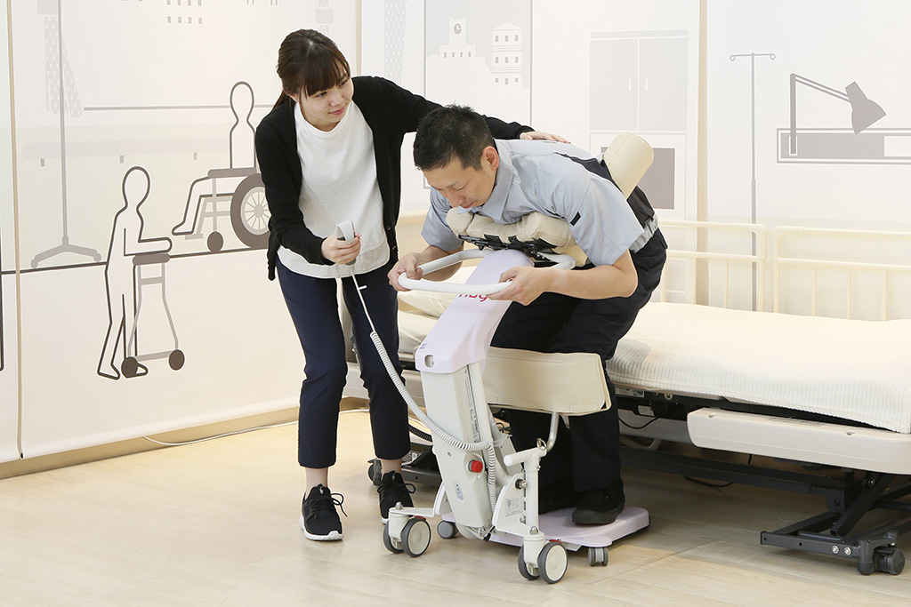 ベッド⇔車椅子⇔お手洗いの移乗介助と立位保持を行なう事ができます。