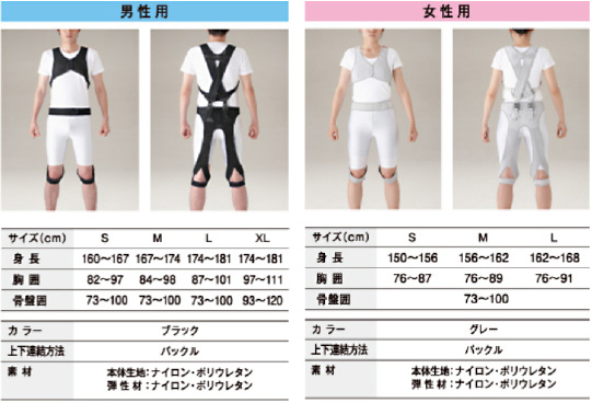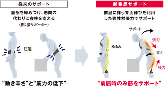 前屈姿勢では、背面が60mmほど伸びます。この伸びを弾性材の張力に変えることで、腰を支える筋の負担を軽減します。また、腰を曲げないときは弾性材は緩んでおり、本来の筋力の低下を防ぎます。