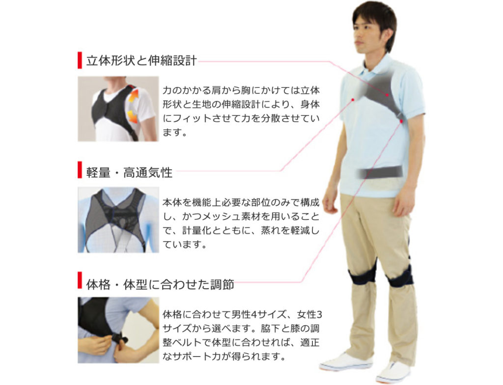 10kgの荷物を床から腰の高さまで持ち上げる実験では、背中の筋の負担が14%、下肢の筋負担も10%程度軽減されることが実証されました。長時間前屈姿勢を維持した場合も、筋負担が同程度軽減されます。