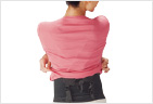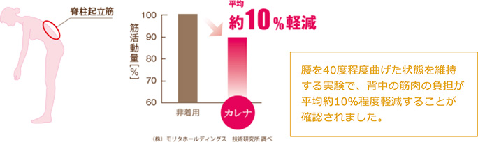 前屈時には背中の表面が伸びます。この伸びを、弾性生地の張力に変えることにより、筋肉の負担を軽減します。また、腰を曲げないときは、弾性生地は緩んでいるため、窮屈感はありません。