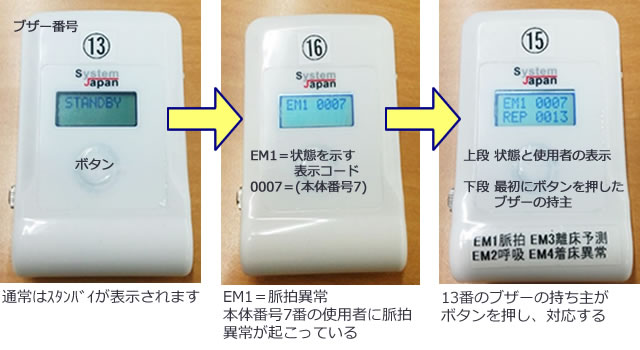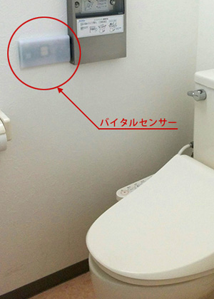 自動測定された正常値を基準のしきい値として、設定された基準値を超えると、警報専用ブザーでお知らせします。離床・着床の信号をその都度知らせることも可能。また、離床して一定時間が過ぎると、トイレ等での異常事態を予測して、警報専用ブザーでお知らせして、確認信号を受信するとブザーは停止します。